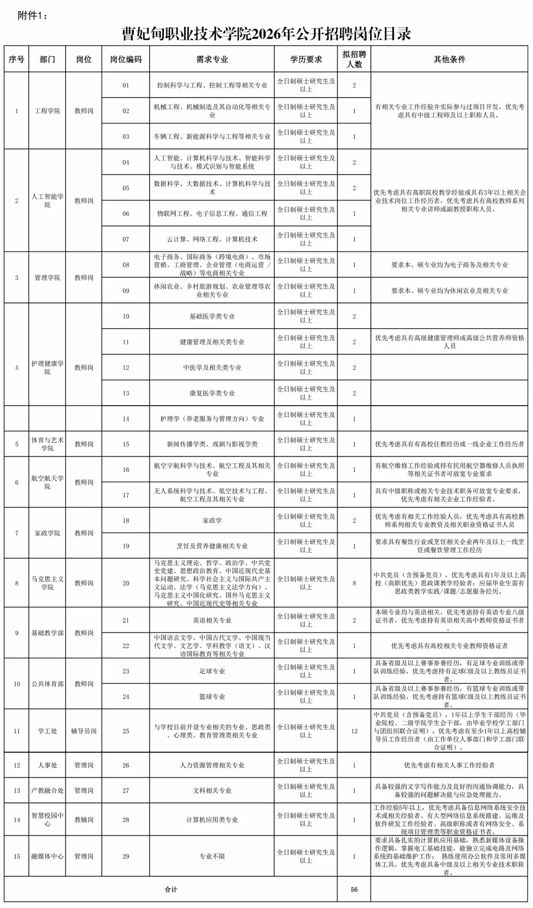 详见《曹妃甸职业技术学院2026年公开招聘岗位目录》(附件1)。